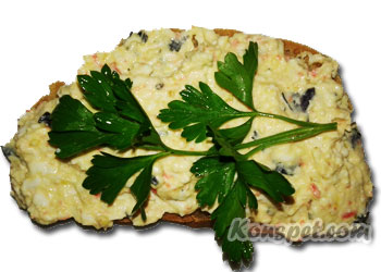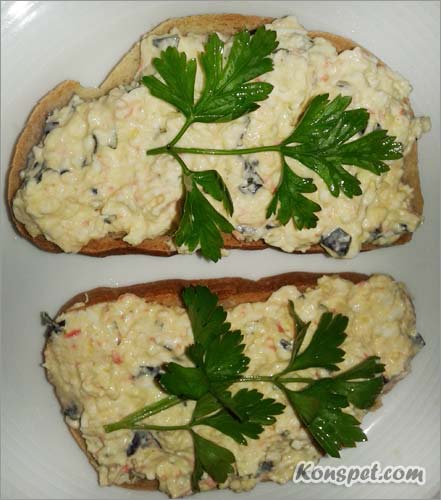 Такой салат уже можно намазывать на подсушенный в тостере хлеб, на гренки, фаршировать яйца. Также с него получается и хорошая начинка для блинов.