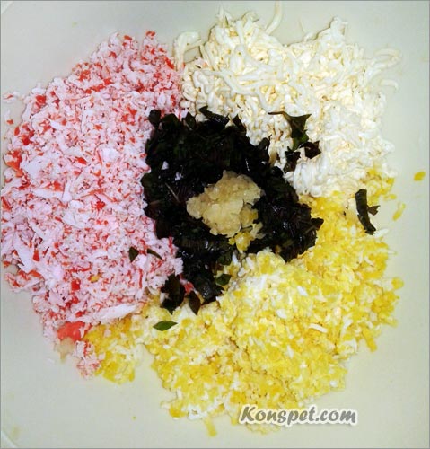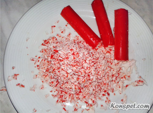 Шаг 3. Замороженные (так легче натирать) крабовые палочки натираем все на той же средней терке: