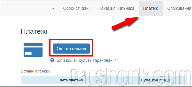 Там находим и нажимаем на кнопку Платежі в верхнем меню.