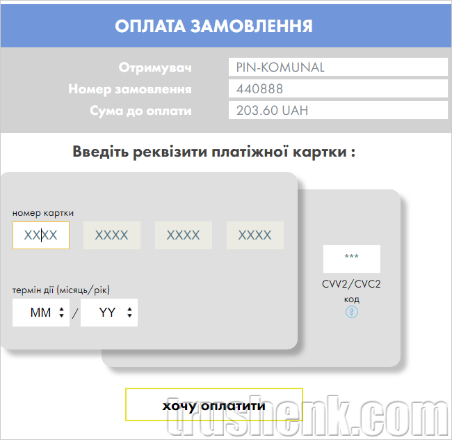 - В следующем окне вводим данные своей банковской карты, и нажимаем манящую кнопку «Хочу оплатити» (а куда деваться?)