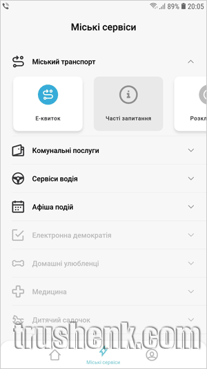 Чтобы увидеть все сервисы, которые есть в этом приложении, необходимо кликнуть по среднему значку Міськи сервіси в нижней части экрана: