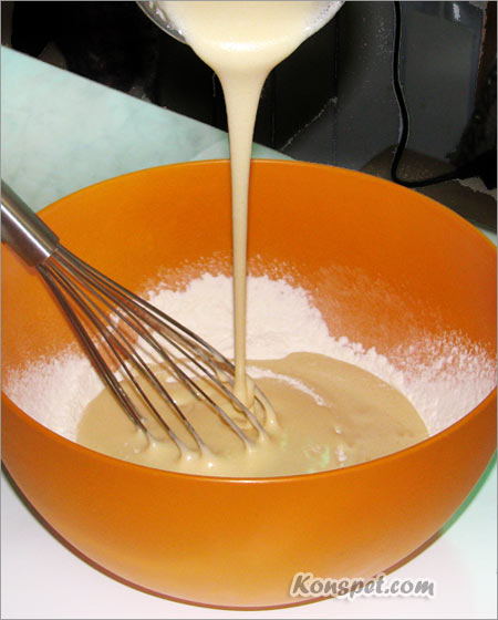 Шаг 3. Взбитые яйца выливаем в просеянную муку, тщательно перемешивая: