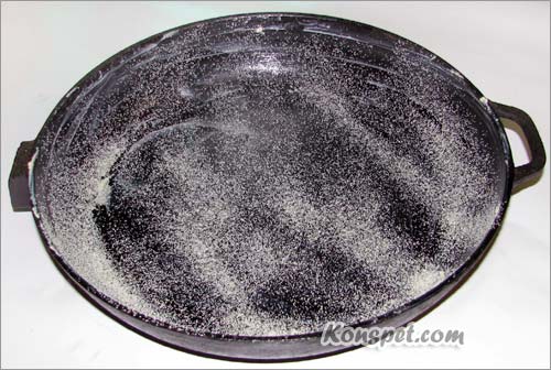 Смазываем сливочным маслом или маргарином и присыпаем манной крупой или сухарями. Можно дробленым печеньем.
