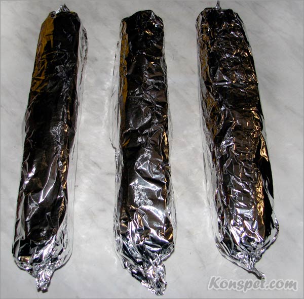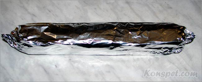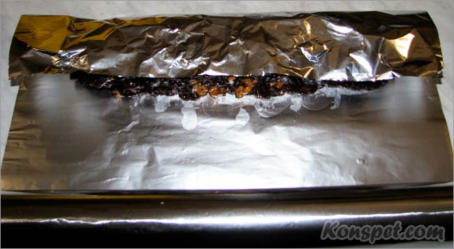 На фольге (или на пищевой пленке) из полученной густой массы формируем колбаску и заворачиваем ее в фольгу, не забывая закрывать и боковые стороны.