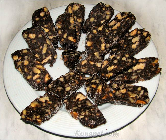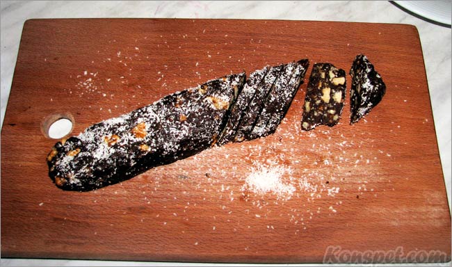 Рецепт сладкой шоколадной колбаски очень напоминает пирожное Картошка.