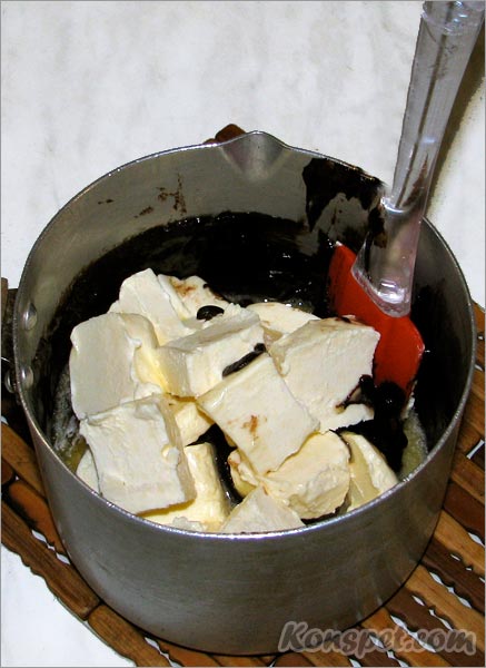 Доводим все это дело до кипения и снимаем с огня. Немного остужаем и добавляем мягкое масло кусочками.
