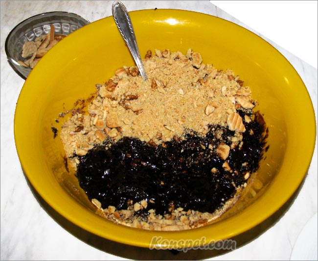 Теперь в шоколадную смесь добавляем орехи (небольшими кусочками) и постепенно всыпаем перемеленое печенье.