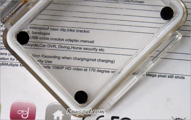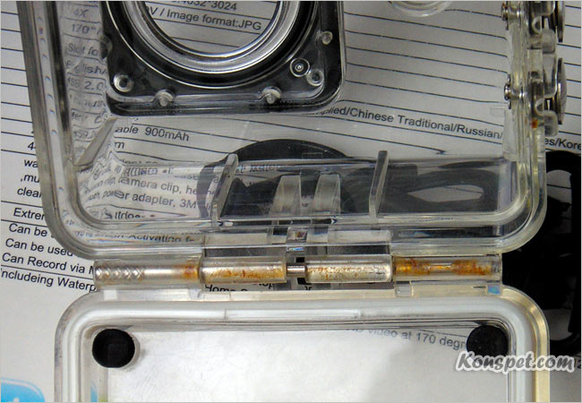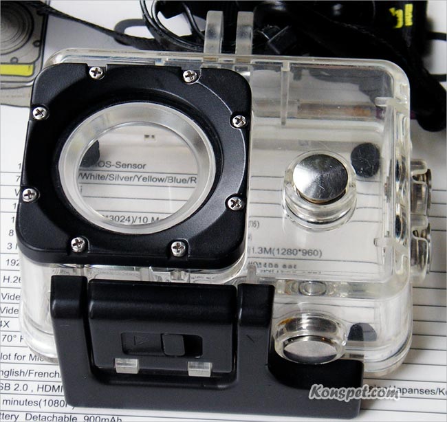 Не перепутайте, и не поставьте прозрачную заднюю крышку, которая идет в комплекте для съемок на суше. Она имеет прорези для записи звука. Ее в воду брать не надо.))