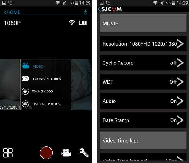 Интерфейс программы SJCAM HD для смартфона