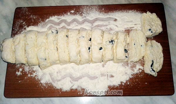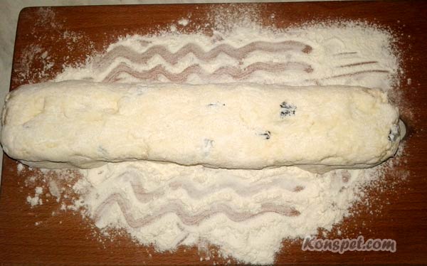 Затем сверху чуть присыпаем мукой, чтобы удобно было сформировать такую колбаску .