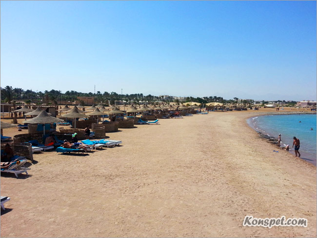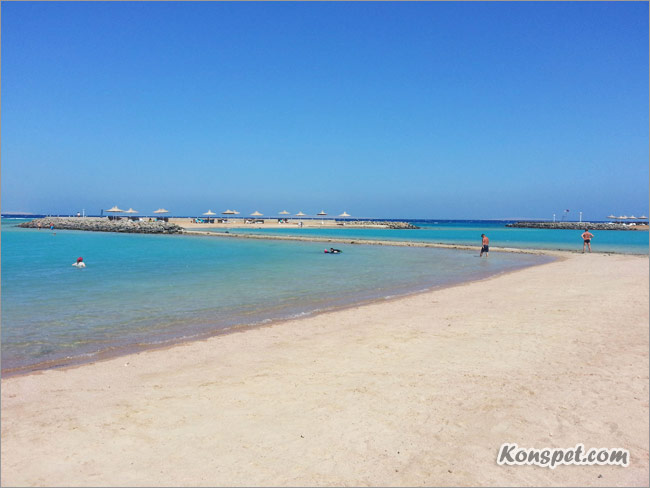 Отель имеет довольно протяженный пляж длиной более километра. Есть две лагуны для купания с плавным заходом в воду, но там жутко скучно.