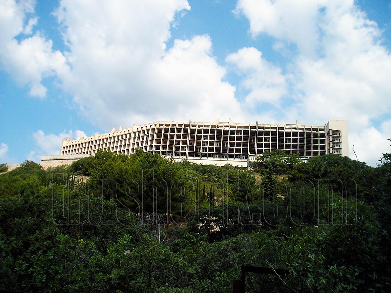 Над всем этим грандиозно возвышается, сияя пустыми глазницами, недостроенное здание санатория. Строили его для архитекторов СССР.