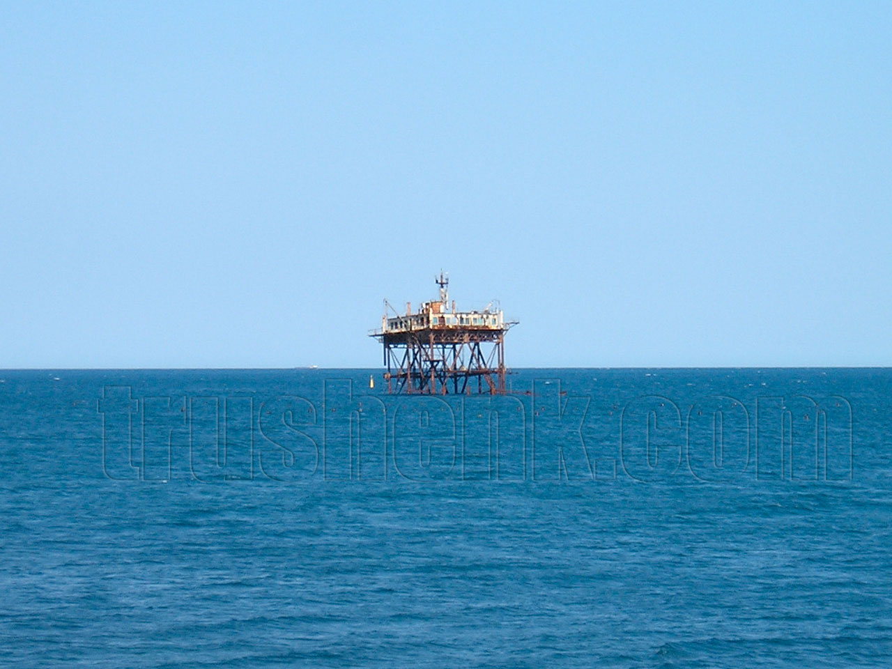 Нижняя часть уже демонтированной второй платформы до сих пор видно как торчащие из-под воды рыжие металлические конструкции.