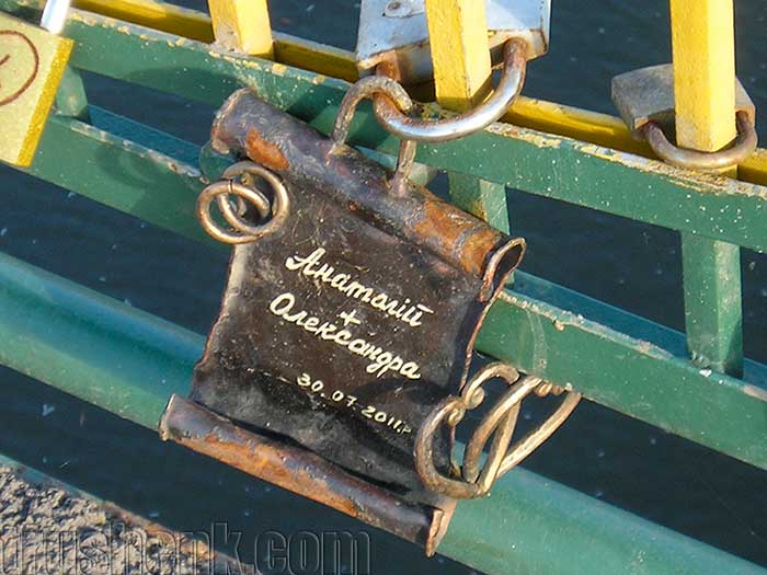 Это различные замки, замочки на перилах и решетке моста. Только в Ужгороде подходят к этому более творчески. Посмотрите сами, как интересно выражают свою преданность влюбленные пары, связывающие себя узами Гименея. Обычно все ограничивается замками разного калибра.