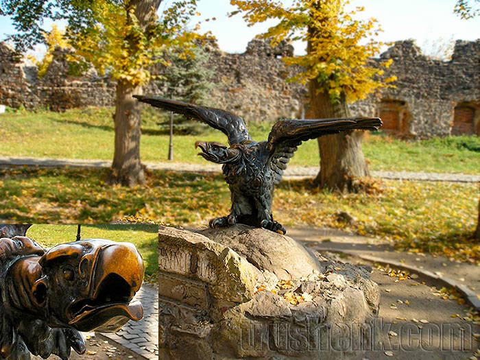 На территории замка несколько скульптур. Впечатляет хищная птица, которая держала когда-то в клюве саблю. Вандалы ее оттуда изъяли. Турул, так зовут этого хищника – птица из венгерской мифологии. Вам расскажут про нее и про связанные с этой этой птицей события красивую легенду. Если вы зашли в замок без экскурсовода, то всегда можно примкнуть к какой-либо группе, которые там в изобилии ходят по территории, по крайней мере в выходные.