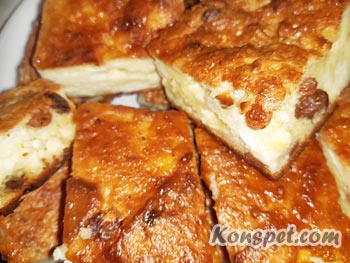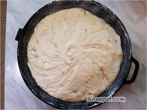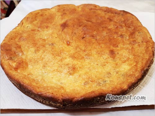 Выливаем массу в смазанную жиром (я смазываю маргарином и притрушиваю манкой) сковороду (без ручки) и ставим в духовку на 40 минут при среднем огне: