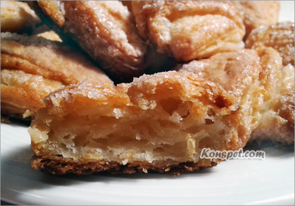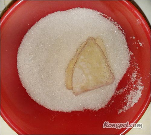 Складываем пополам (сахар внутри) и еще раз (уже половинки) обмакиваем в сахар: