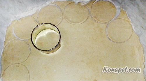 Затем выдавливаем стаканом кружочки диаметром примерно 7 см. (я выдавливаю формой для салатов):